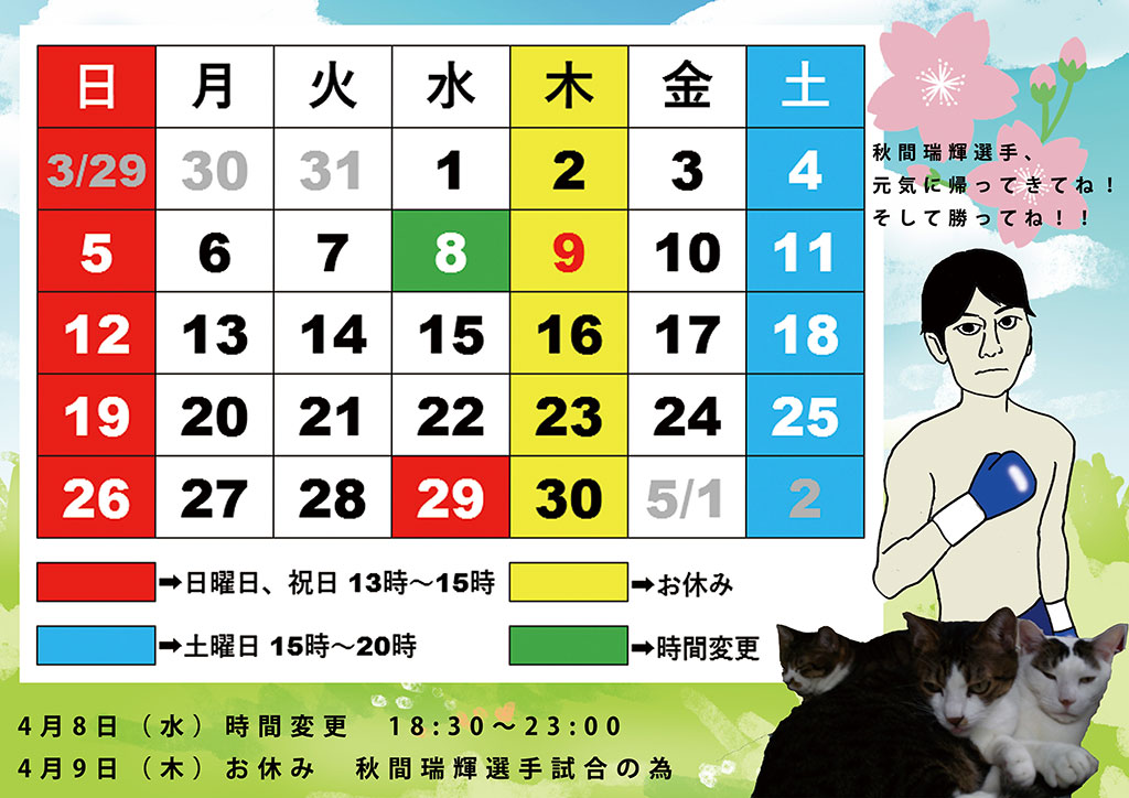 ●4月のお休み・時間変更 【お休み】木曜日(2日、9日、16日、23日、30日) 9日(木)秋間瑞輝選手試合の為 【時間変更】8日(水)18:30〜23:00